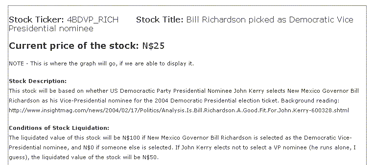 So how do you approach purchasing this stock? If you think that Richardson having a 25% chance of being appointed is way too low and that he's almost a lock for VP, you should buy the stock at $N25, as the stock will rise, and you will be able to sell back the stock at liquidation for N$100 a share. But if you think that the chance of him being appointed is lower than 25% (or the chance of someone else being appointed higher than 75%), then you should short sell the stock, pick up N$25 a share right now, and buy back the stock at liquidation when it is priced at N$0 (thus not having to spend any money whatsoever).