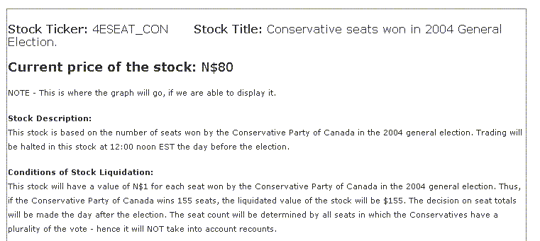 Here is a stock based on the number of seats the Conservatives will win in the 2004 general election. As you will note, the final (liquidated) value