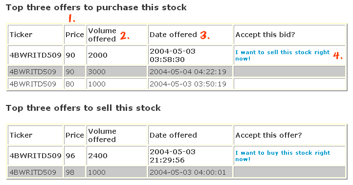 If so, fill out the appropriate form, indicating the quantity of shares you want to offer, whether you are offering to buy or sell the stock, and the price at which you are making the offer. Once you hit the button, the computer will process your offer, and if your offer is acceptable, it will be added to the queue. If your offer is the best ranking price of all offers (and is the earliest offer at that price), your offer will be the ranking price, and other contestants can immediately take you up on your offer!