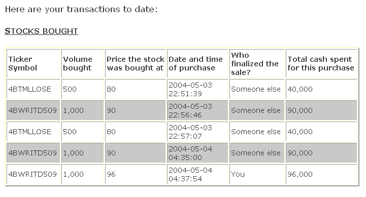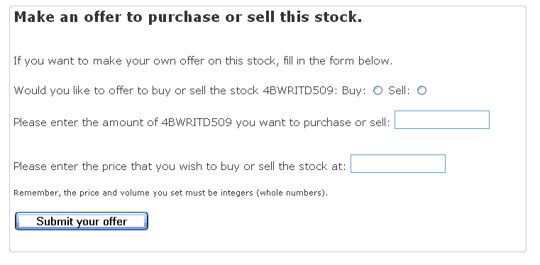 From there, you'll be taken to a page where you are presented with the total volume of stocks you are allowed to buy or sell (based on your current holdings of the stock, the maximum or minimum limits of the stock that you can hold, and any oustanding offers to purchase or sell the stock that you have). You can then enter into the form the number of stocks that you want to buy or sell. Then click on the button to finalize the transaction. Once this transaction is made, ALL SALES ARE FINAL. No refunds, baby.