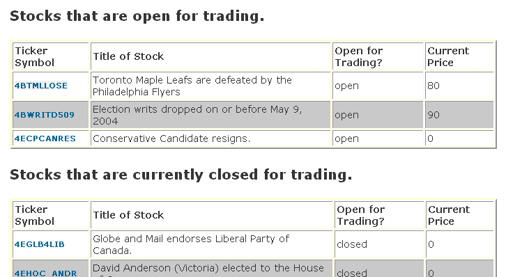 The following eight characters describe, as best as one can with any eight letters or numbers, the stock being traded. The first three or four characters may refer to a particular subset - for example HOC is used in the 2004 General Election series (4E) to indicate that this stock refers to whether certain members get elected to the House of Commons; i.e. 4EHOC_ANDR trades on David Anderson's election in Victoria in 2004, while 4EHOC_BRIS trades on Scott Brison's election in Kings-Hants. Likewise SEAT refers to stocks traded on the basis of House seats won by the parties in the 2004 election. None of this is really all that important. I'm not sure why it merited two paragraphs. I think my wife probably laced my coffee.