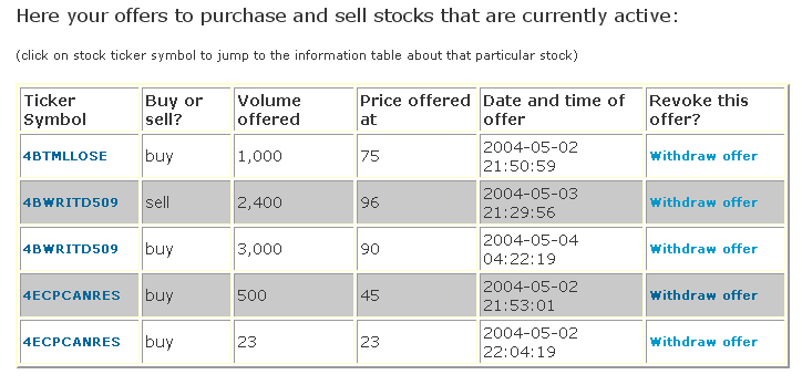 On this page, you can also see your standing offers to purchase or sell stocks. If you want to withdraw any of your offers, either because the price is no longer appropriate, or to clear room for another offer, just click on the "withdraw offer" link next to the appropriate offer. Remember, you can not alter the terms of an existing offer, you must withdraw and resubmit a new offer (and hence risk being punted to the back of the queue).