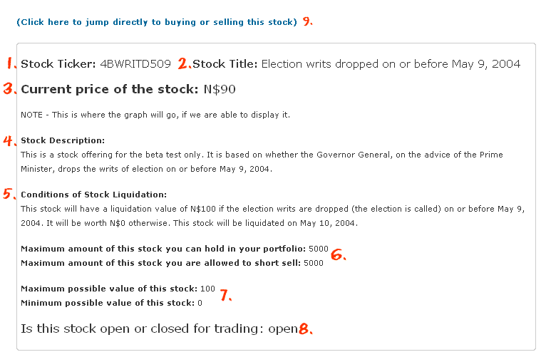 1. The stock ticker symbol. This is the ten-character symbol that identifies the stock to the computer. It's a lovely and incomprehensible mess of letters and numbers. Breaking it down, the first two characters indicate the series of the stock - for example, 4E indicates that the stock is issued as part of the 2004 General Election version of the NPFM, while 4B indicates that the stock is issued as part of the 2004 Beta test for this contest.